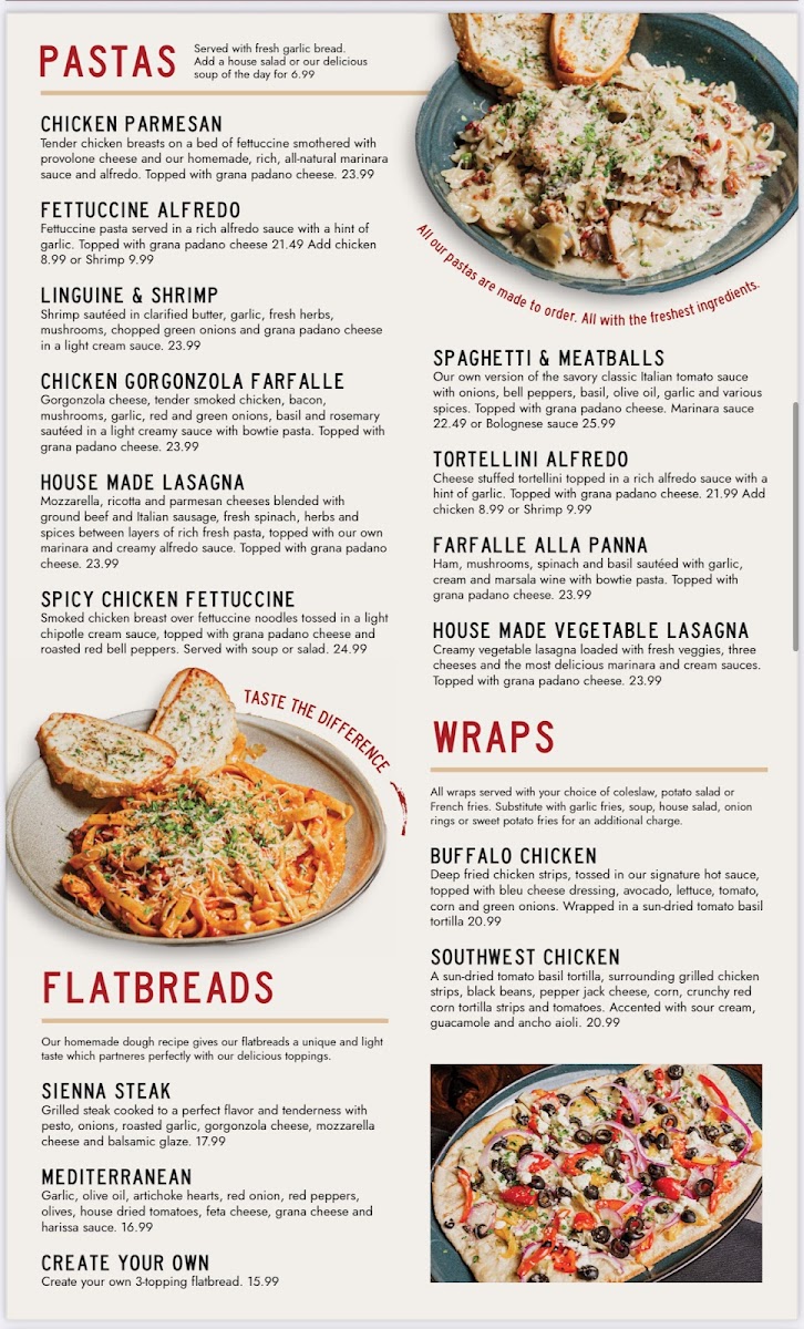 Indulge in the hearty Fish & Chips, featuring a half-pound filet of golden brown cod, perfectly complemented by homemade tartar sauce. For seafood lovers, the Atlantic Salmon is charbroiled and served atop a bed of linguine, drizzled with a creamy lemon sauce.
