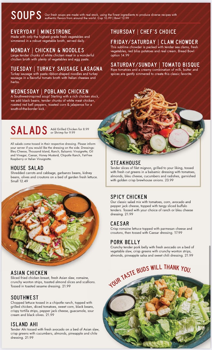 Tender slices of filet mignon, grilled to your liking, tossed with fresh cut greens in balsamic dressing with tomatoes, almonds, bleu cheese, cucumbers and radishes, garnished with golden crisp Brewhouse onions